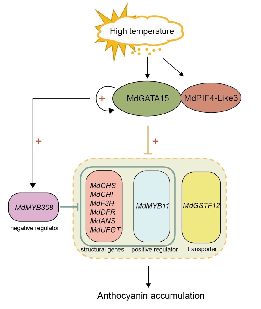 高温诱导MdGATA15抑制苹果花青苷积累的调控模式